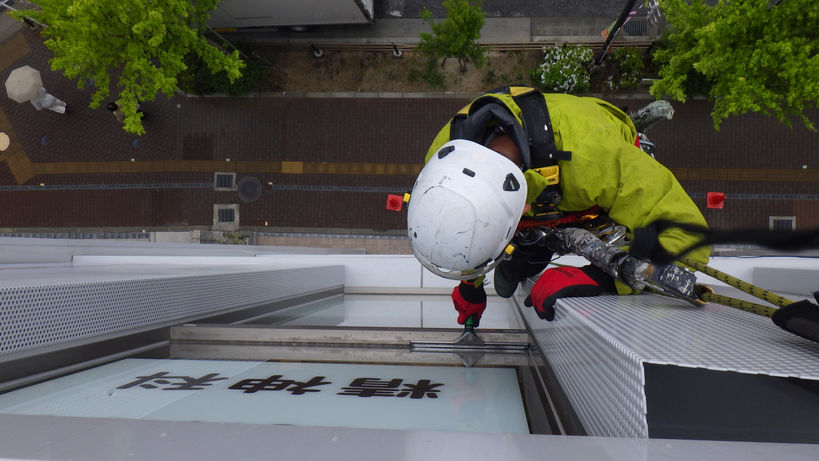 日本で一番馴染みのあるロープでの窓ガラス掃除ですが、弊社のロープアクセス技術であれば、着地できない場合や難所でもおまかせください。